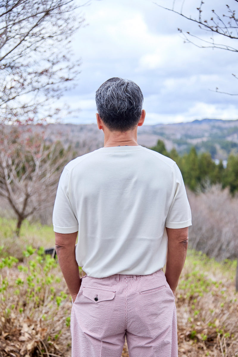 【生地:アメリカンシーアイランドコットン60/2】使用しているのは、世界でも限られた地域でしか栽培されない希少な超長綿、アメリカンシーアイランドコットン。その中でも、極細の「60番手」の糸を2本撚り合わせた“60/2(ろくまるにそう)”仕様に仕上げることで、薄く、軽やかで、しなやかなハリ感を備えた、まさにサマーニットの理想形を実現しました。