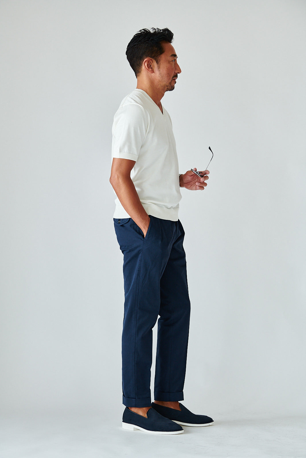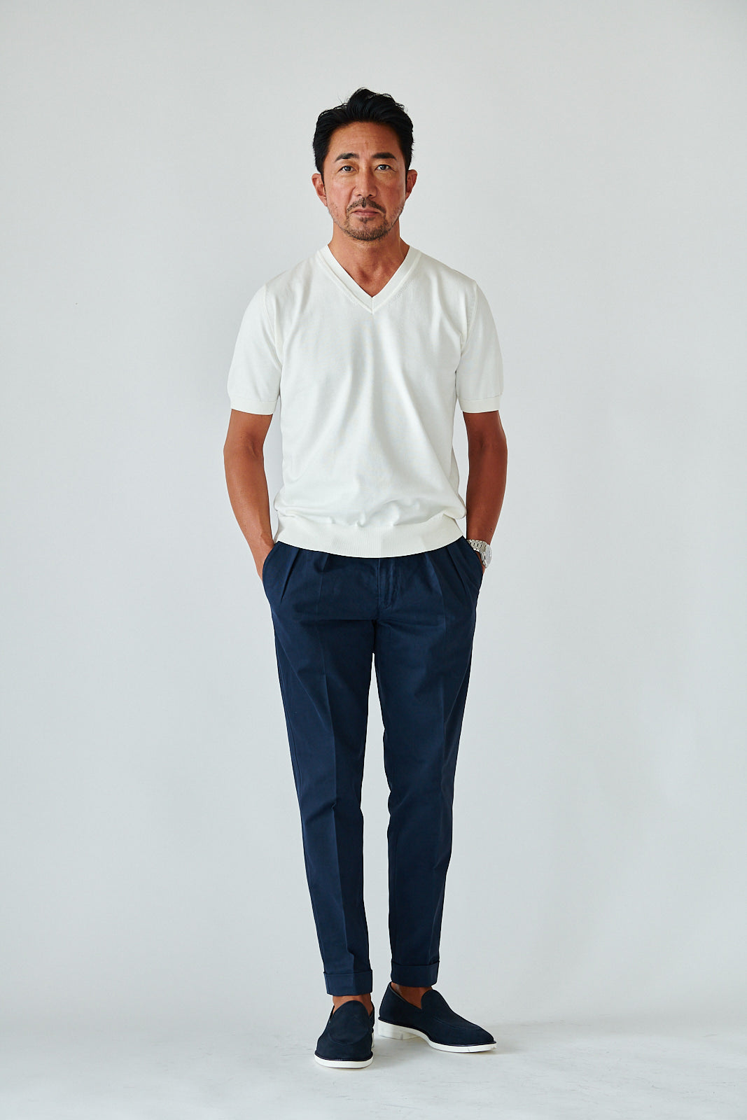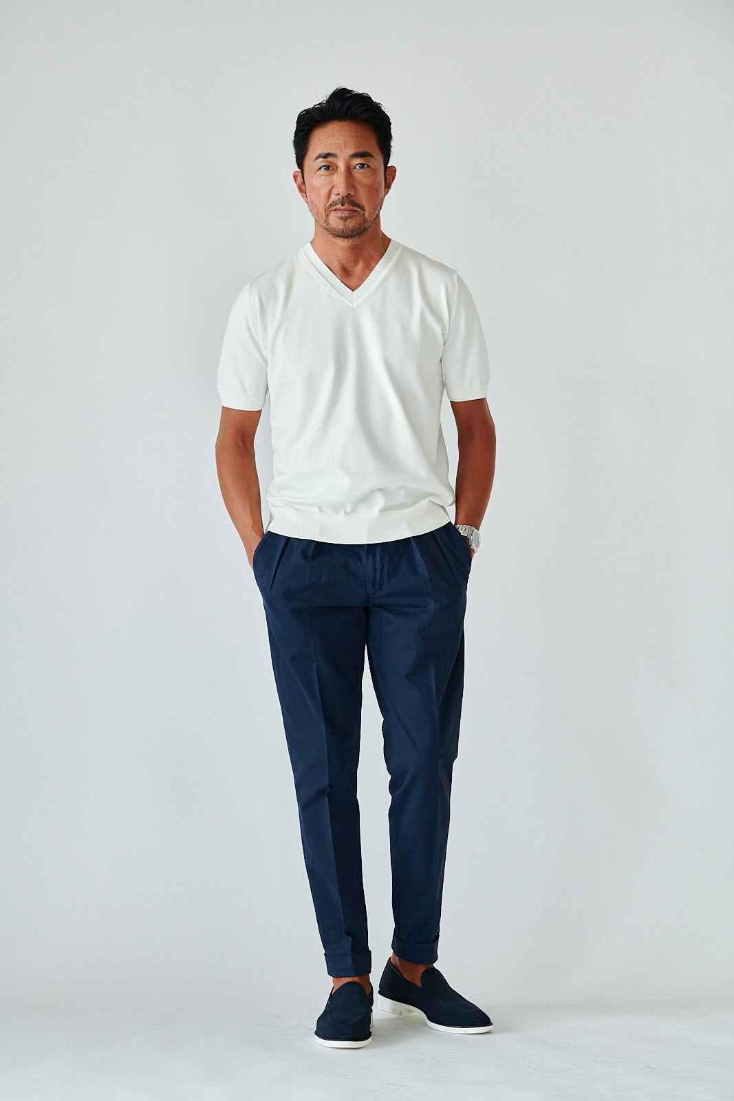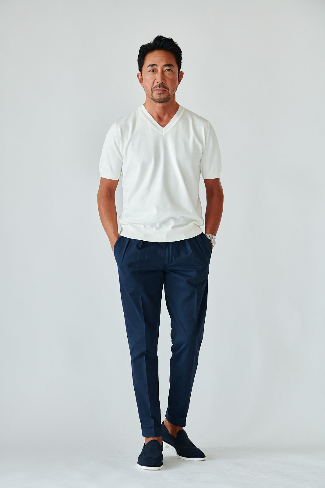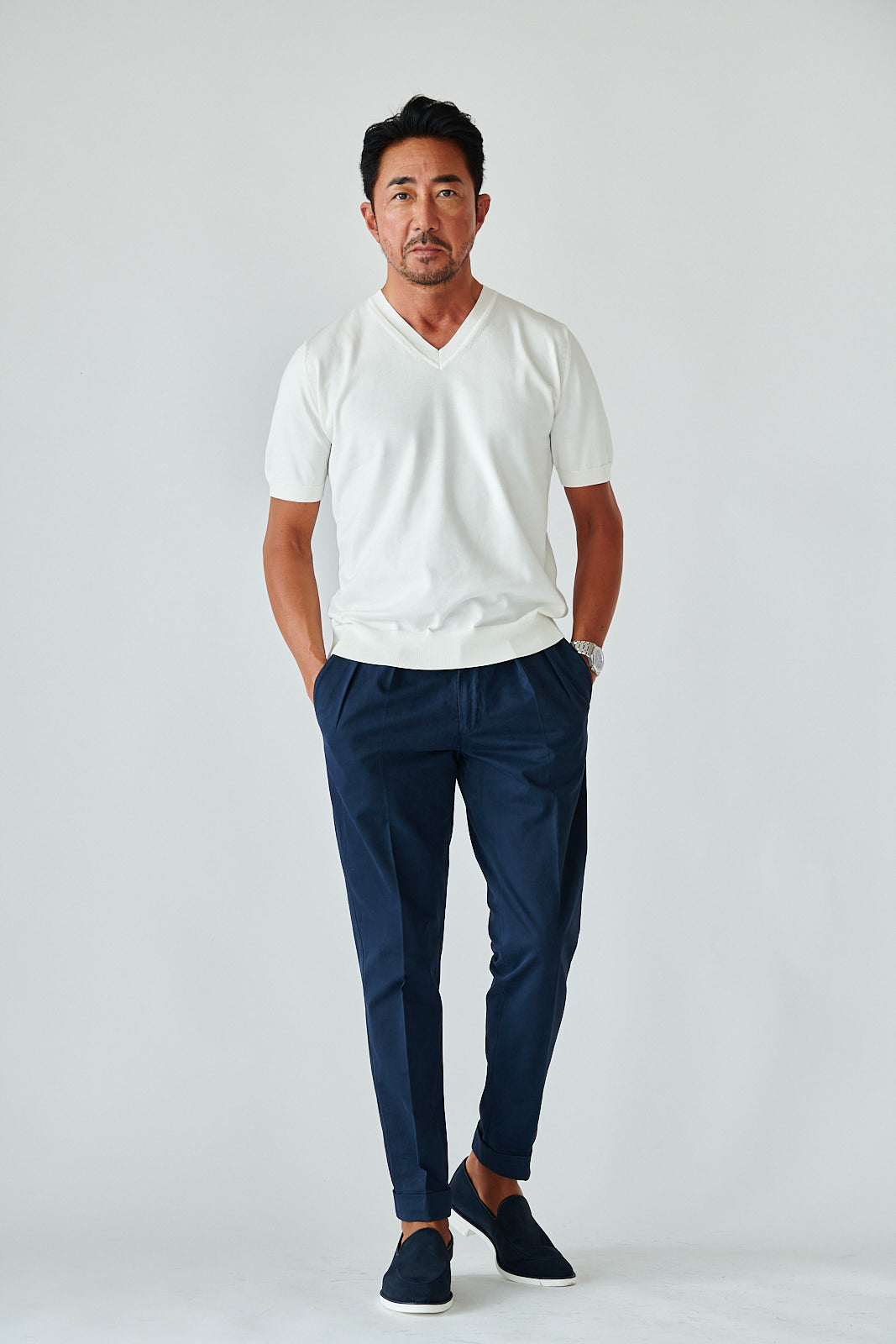 デザインはあくまでミニマル。シンプルなVネックが、大人の余裕を引き立てる。カジュアルにも、ジャケット合わせにも映える万能さで、着こなしの幅は無限です。