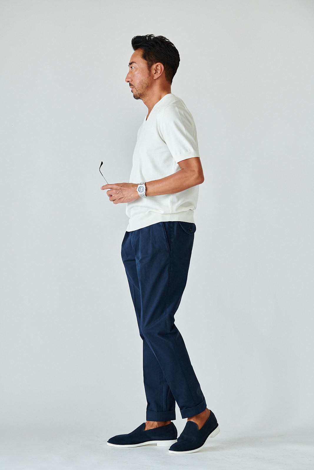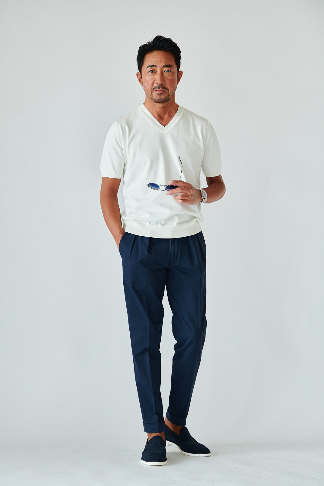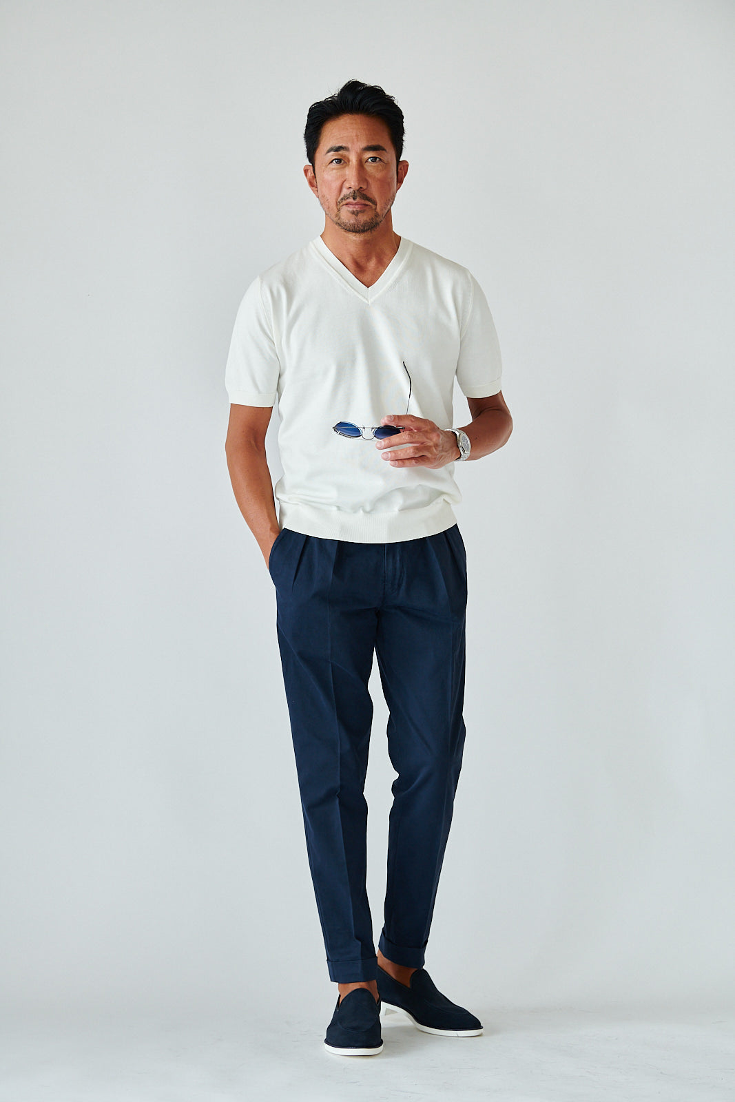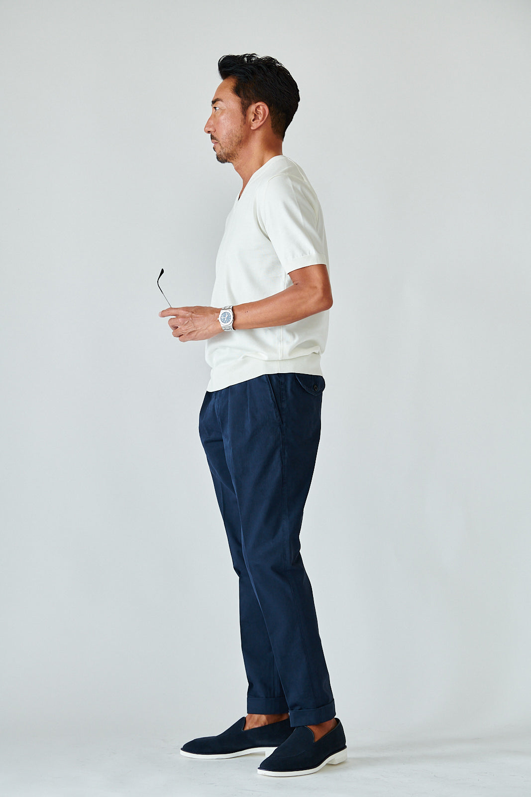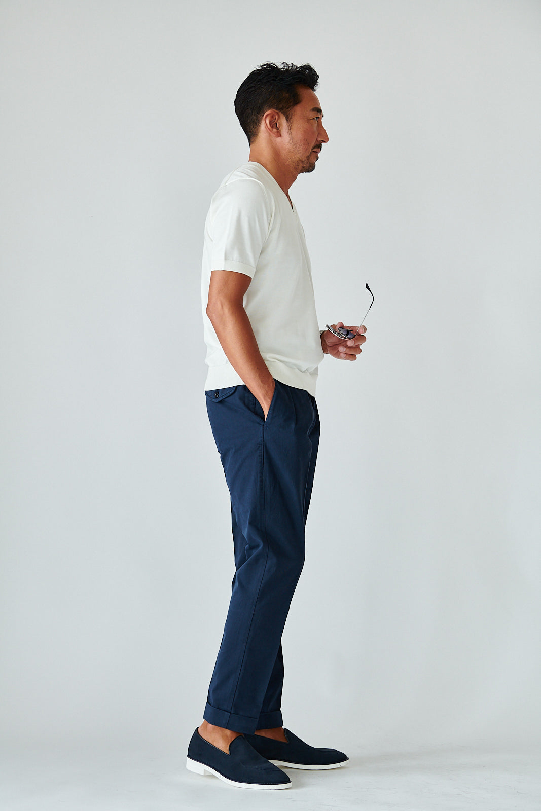 デザインはあくまでミニマル。シンプルなVネックが、大人の余裕を引き立てる。カジュアルにも、ジャケット合わせにも映える万能さで、着こなしの幅は無限です。